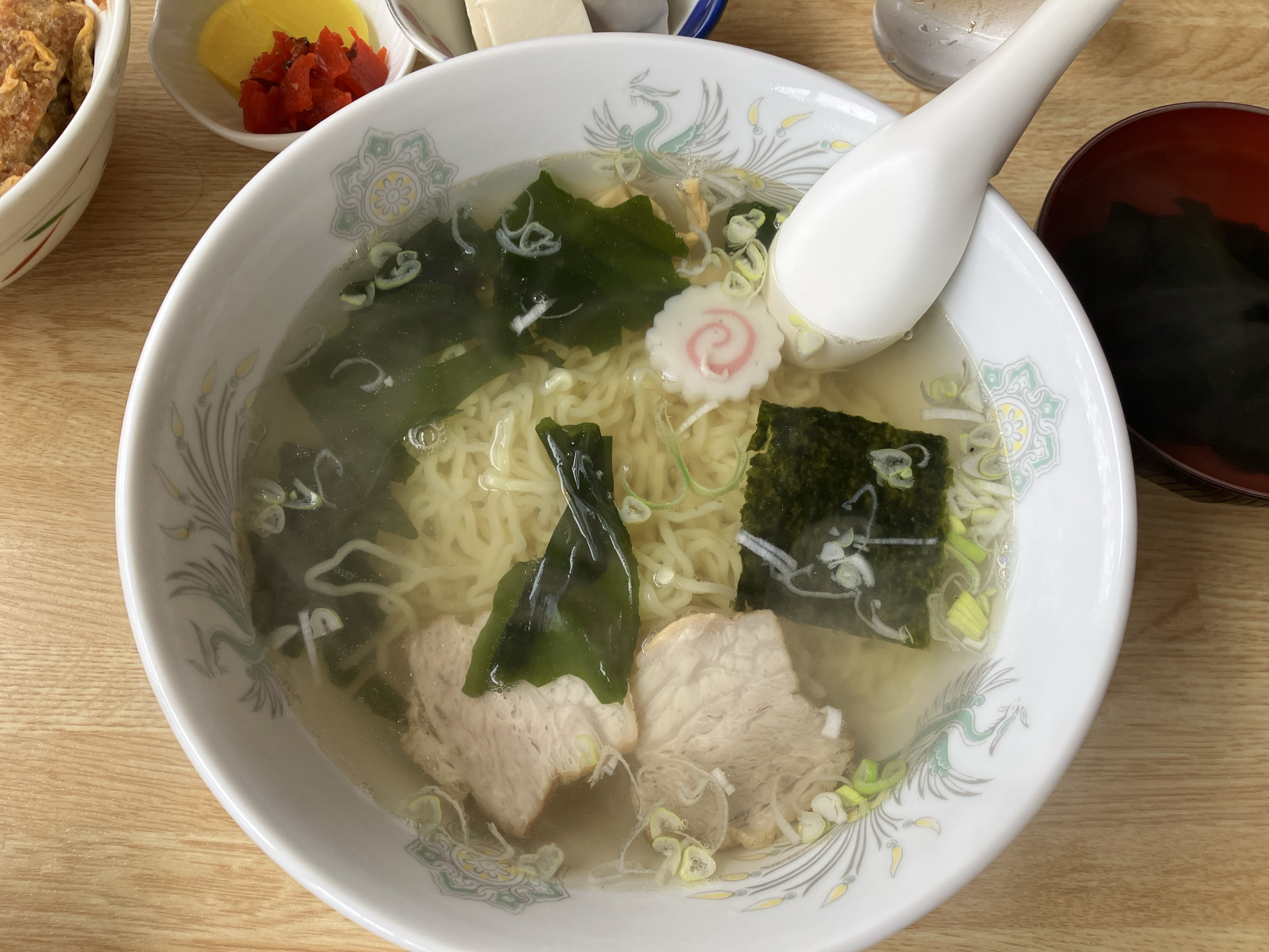 | ラーメンをいただきました。 具はわかめ、のり、メンマ、ナルト、 ネギ。とてもおいしかったです。 ごちそうさまでした!! |