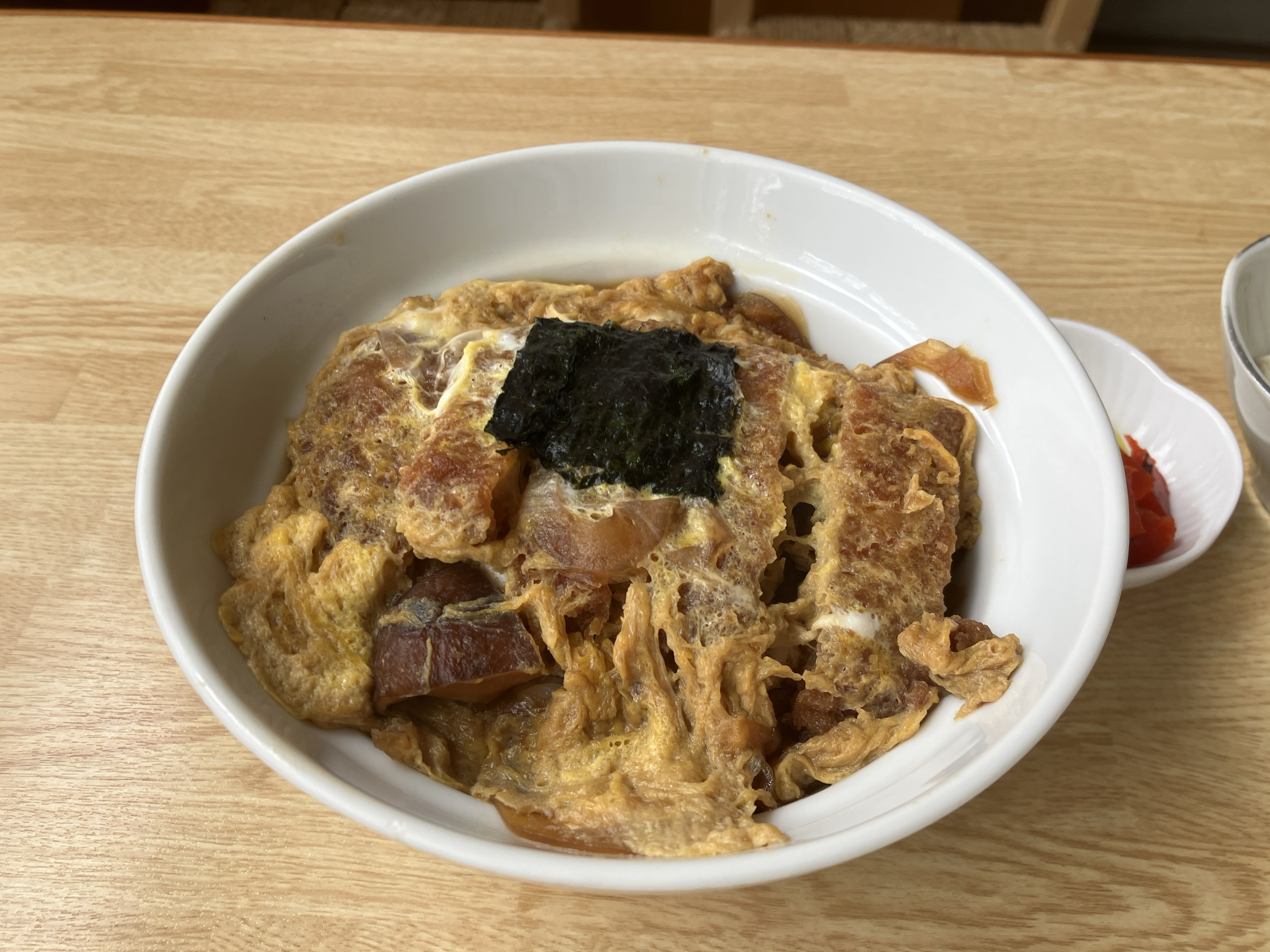 | こちらは「カツどん(ご飯少なめ)」です。 のりが乗っていました。椎茸も。 |
